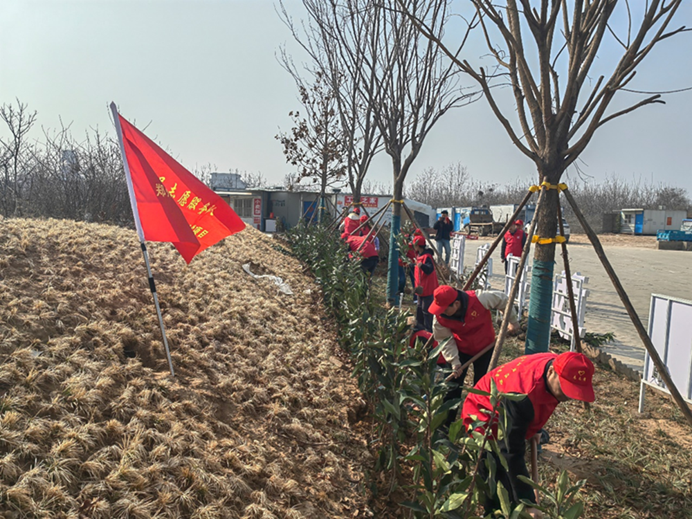 3月12日,阳光明媚,春意盎然,党员志愿服务队士气高昂,手拿铁锹、水桶、扫把等工具,热情高涨地投入到植树活动中。