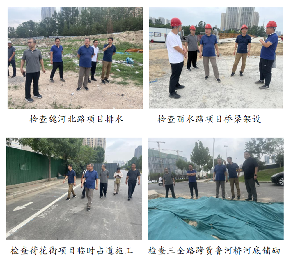 黄志澎分别检查了魏河北路项目的排水、丽水路项目的桥梁架设和道路施工、洛达路项目和荷花街项目与周边道路的安全衔接、三全路项目的河道铺砌和下穿铁路涵洞泵站,并查看了防汛物资准备情况。